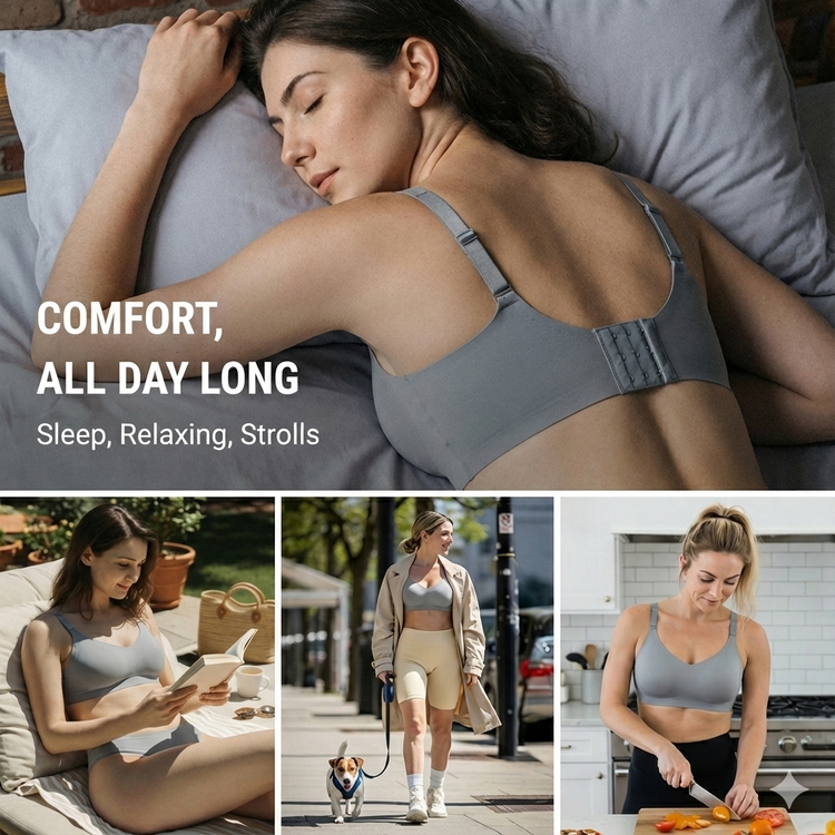See how Feelingirl’s wire-free bra moves with you all day. Our ultra-elastic fabric and adjustable straps provide personalized gentle support. Experience breathable, unlined comfort whether you're out shopping or lounging at home.